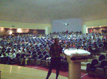 Dr. Lancman explaining epilepsy surgery and diets to a full auditorium